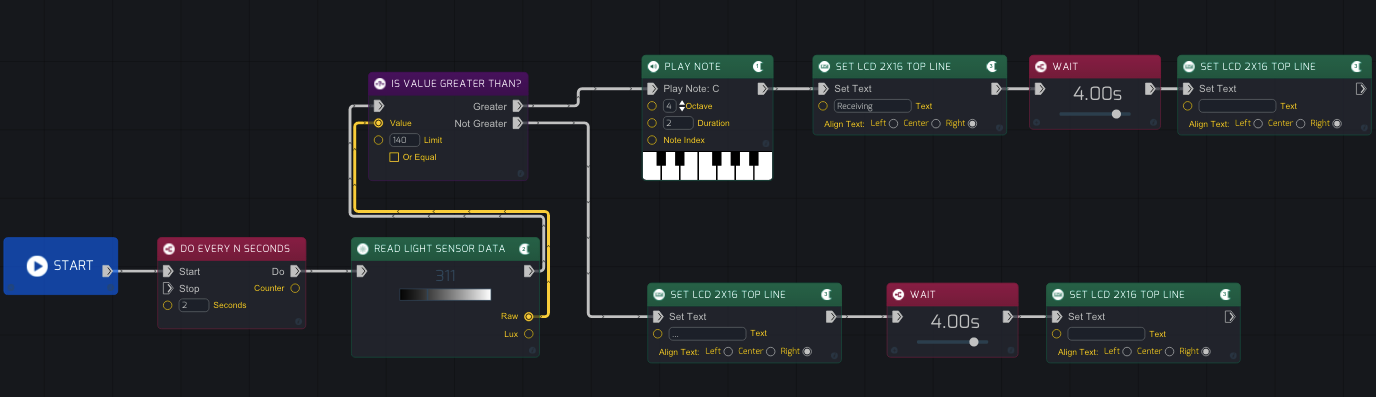 Attach and program an indicator that indicates when a signal from the original light beam is being received by the sensor. Sample codes for both Python and block code are provided below but will vary by device.