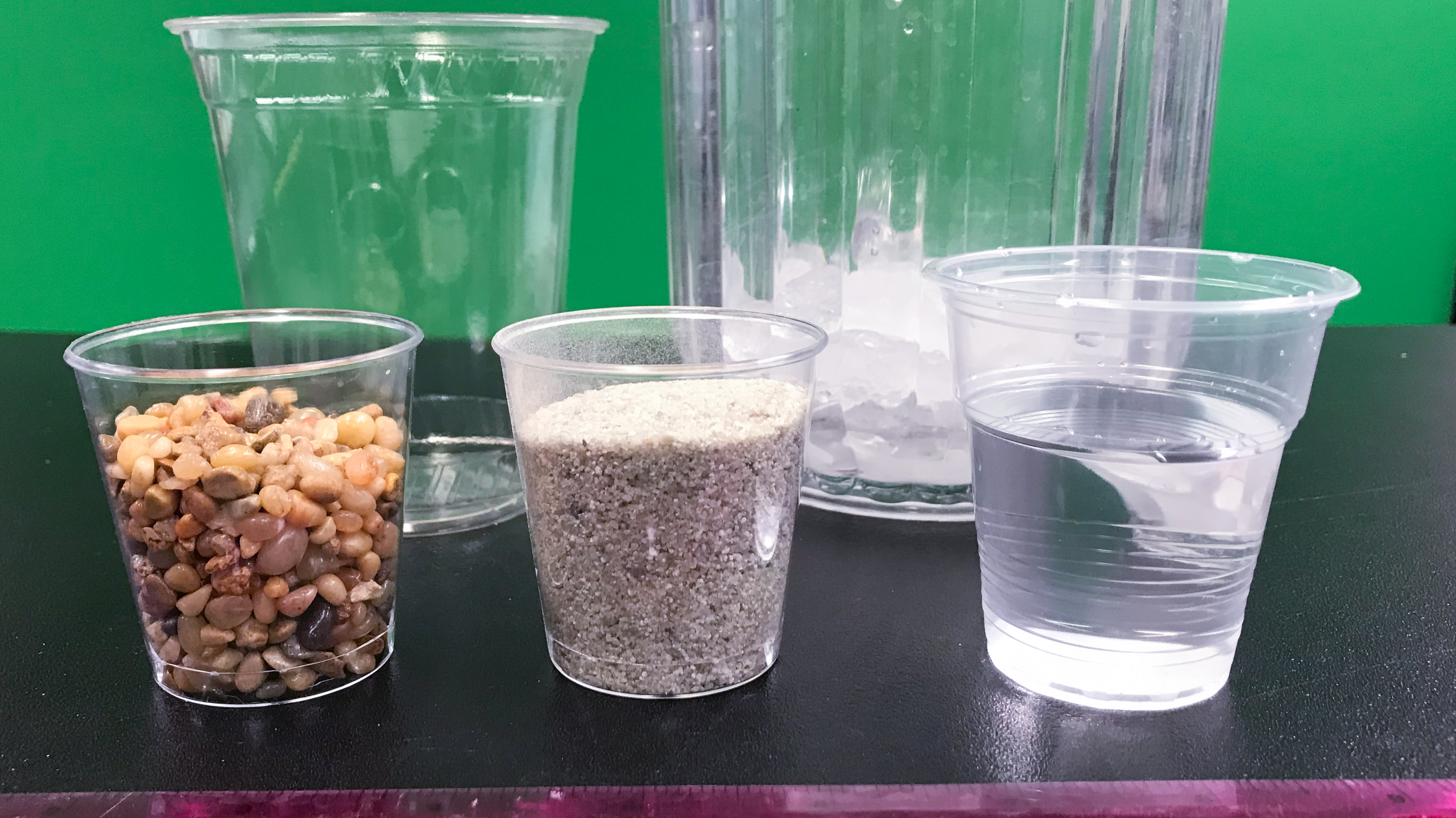 - A variety of granular materials more dense than water (rice grains, sand, corn kernels, etc.)