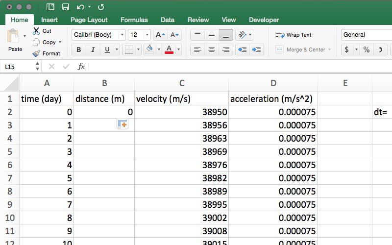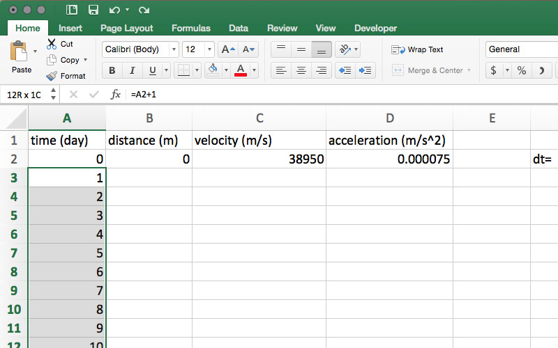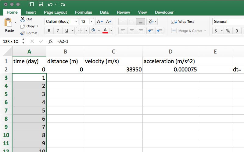 Select cell D2 and, as described in Step 11, click and drag to autofill cells D3-D367 with the spacecraft acceleration.