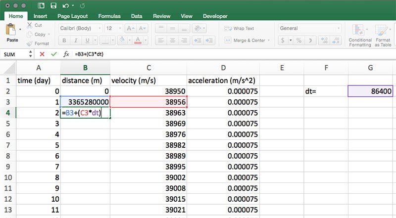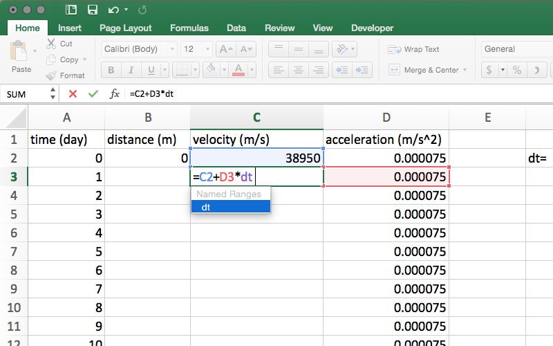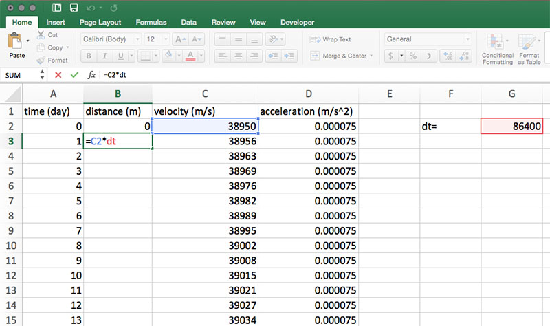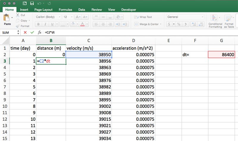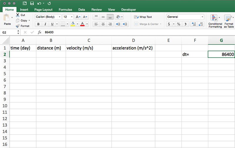 This model calculates and graphs distance, velocity, and acceleration in days, but the time units used on the data sheet are in seconds. To calculate the distance traveled in one day, we need to multiply velocity by the number of seconds in one day (86,400). So, in cells A1, B1, C1 and D1 enter time (day), distance (m), velocity (m/s), and acceleration (m/s2), respectively. In cell F2, enter dt= and in G2, enter 86,400. Define the name of cell G2 as described in Step 7.