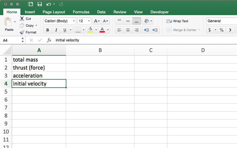 Open a spreadsheet and rename it "data" by right clicking on the Sheet 1 tab at the bottom of the page and selecting Rename. In column A, enter total mass into A1, thrust (force) into A2, acceleration into A3, and initial velocity into A4. It is not required that the cells are labeled in that order, but the remaining instructions reference the cells in that order.