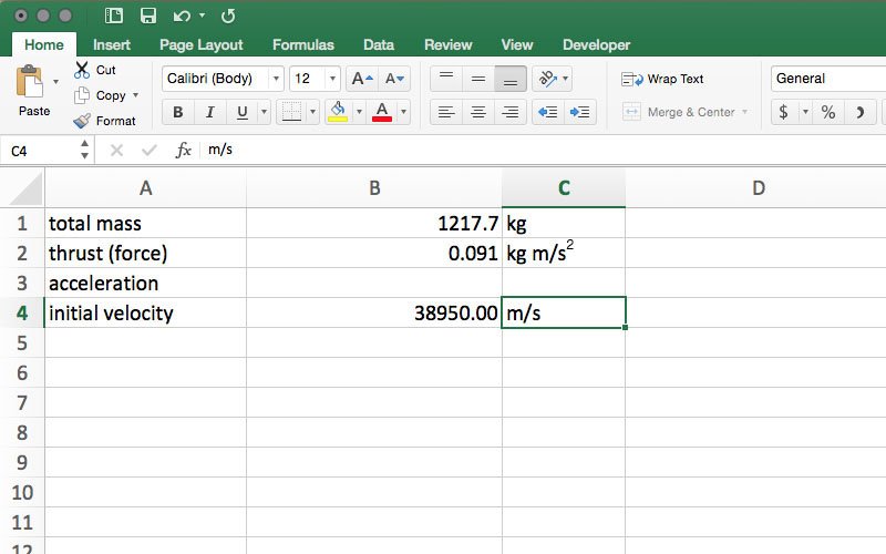 In column B, enter the total mass of 1217.7 or 2,747 in B1. These are the respective masses in kilograms of the Dawn and Psyche spacecraft at launch. Because these units are in kilograms, kg should be entered into C1. In cell B2, enter 0.091 or 0.28 – the force in newtons (N) applied to the Dawn and Psyche spacecraft by the ion engines, respectively. For this spreadsheet, rather than labeling newtons "N," enter kg·m/s2 in cell C2. In cell B4, enter 11,460 or 5,800. These are the two spacecraft's highest speed relative to Earth after being released from the rocket. This speed is in meters per second, so enter m/s in cell C4.