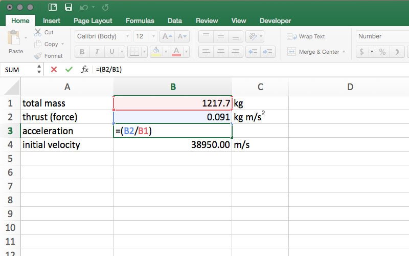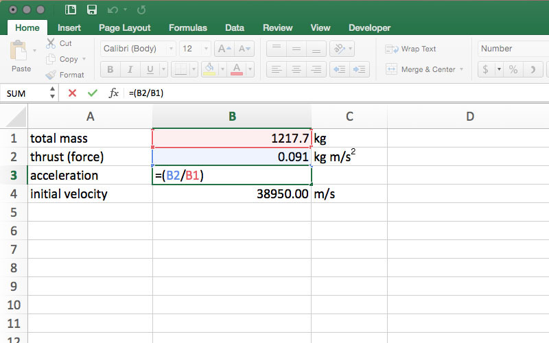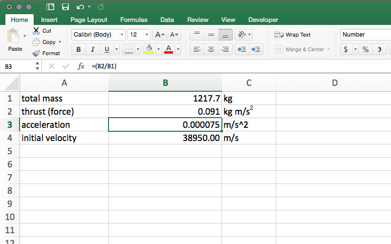 Once =(B2/B1) is entered into cell B3, the spreadsheet will calculate the value for acceleration. In this model, the result is very small, so small, in fact, that the default number format in many spreadsheet programs will show zero in cell B3. To see the full result, format the cell as a number, and increase the number of visible decimal places until a small decimal value is visible in cell B3. Acceleration units are m/s2, so in cell C3, enter m/s2.