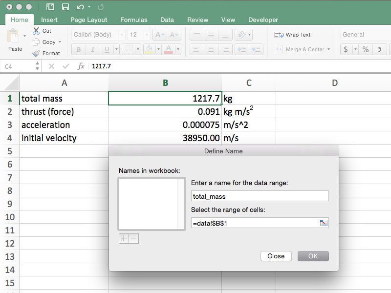 References to cells will be made on a separate sheet within the workbook. To simplify the references, define names for cells B1, B2, B3 and B4 by right clicking on the individual cells and selecting Define Name... from the drop-down menu. In the window that appears, a suggested name will appear (e.g., total_mass for cell B1) that can be kept as is or changed to any desired name, but keep in mind that these instructions assume the use of the suggested name. Repeat this process for each cell in column B. In older versions of Excel, click the cell to be named, then select Name from the Insert menu and click Define...