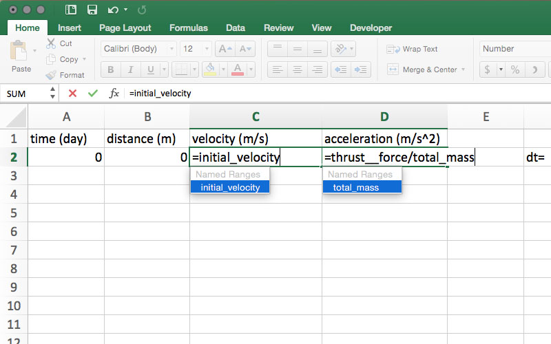 - Excel contains the functionality to create sliders that would allow students to "throttle" the thrust and adjust the amount of fuel in the tanks. Add these requirements in for an added challenge.