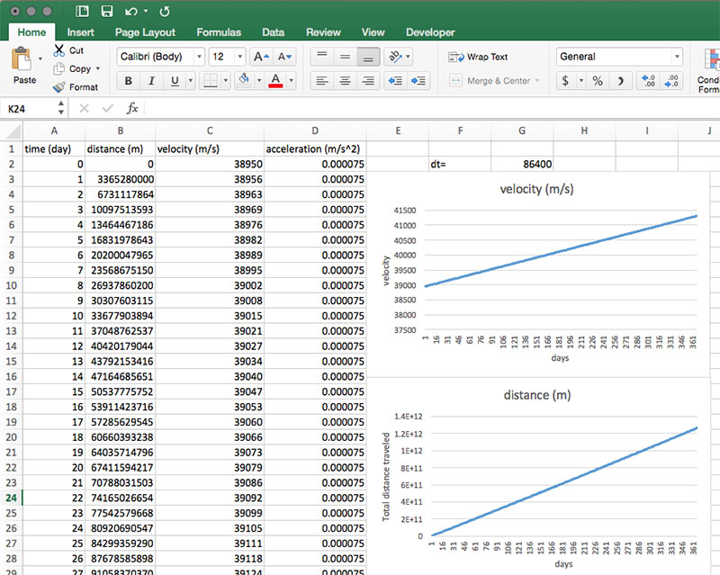 - What is the total change in velocity in meters per second over the course of one year? In spreadsheet software, the answer can be found by entering =C367-C2in any empty cell on the calculations page.