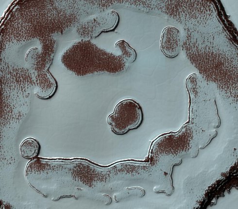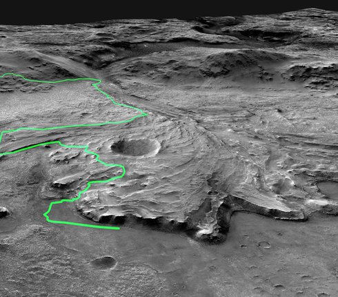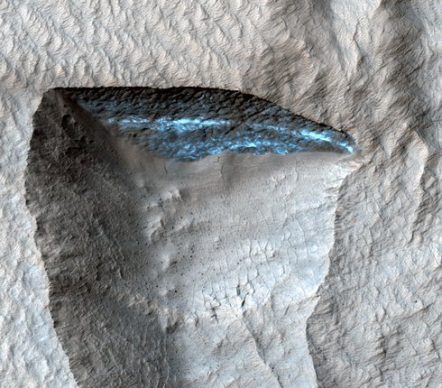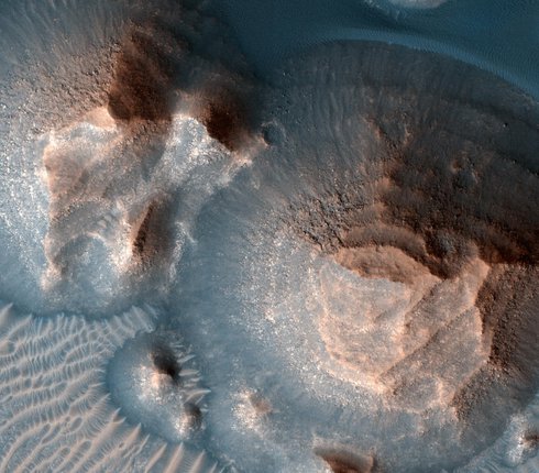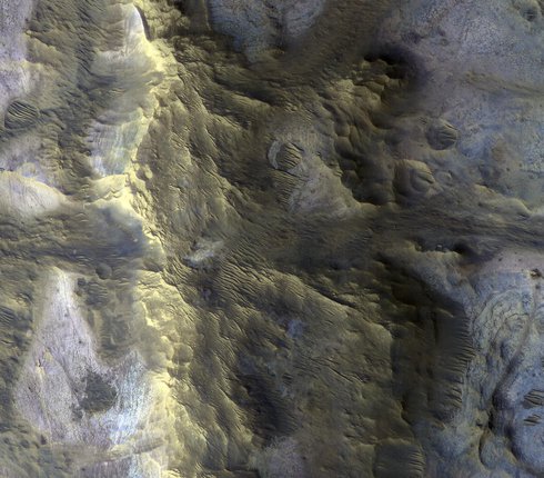 The fans built up over time during intense rain storms or from melting snow. Due to the strong winds on Mars, the river channels that once carried water and sediment on the fan surfaces are now standing as raised ridges and platforms. A thin blanket of ejecta (upper right) from a small crater on Roddy's eastern rim protected underlying fan surfaces from modification by the wind compared to nearby, unprotected fans (left). The scarp beneath the thin ejecta surface exposes beautiful light-toned layers from the alluvial fans below.