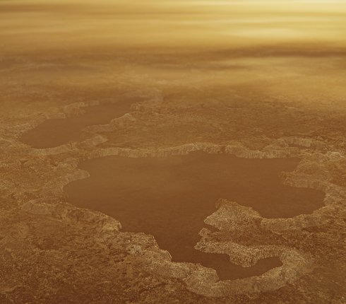 The map legend colors represent the broad types of geologic units found on Titan: plains (broad, relatively flat regions), labyrinth (tectonically disrupted regions often containing fluvial channels), hummocky (hilly, with some mountains), dunes (mostly linear dunes, produced by winds in Titan's atmosphere), craters (formed by impacts) and lakes (regions now or previously filled with liquid methane or ethane). Titan is the only planetary body in our solar system other than Earth known to have stable liquid on its surface — methane and ethane.