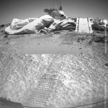 Photojournal note: Sojourner spent 83 days of a planned seven-day mission exploring the Martian terrain, acquiring images, and taking chemical, atmospheric and other measurements. The final data transmission received from Pathfinder was at 10:23 UTC on September 27, 1997. Although mission managers tried to restore full communications during the following five months, the successful mission was terminated on March 10, 1998.
