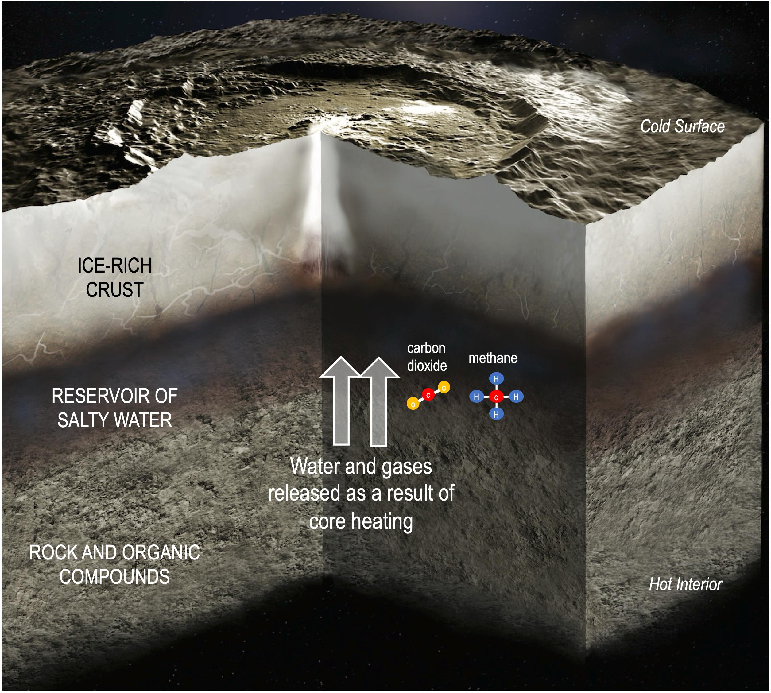 This illustration depicts the interior of dwarf planet Ceres, including the transfer of water and gases from the rocky core to a reservoir of salty water as a consequence of internal heating. A couple examples of molecules carrying chemical energy – carbon dioxide and methane – are included in the illustration. Research published in Science Advances on Aug. 20, 2025, relies on data from NASA's Dawn mission to find that chemical energy inside Ceres may have lasted long enough to fuel microbial metabolisms. Although there is no evidence that microorganisms ever existed on Ceres, the finding supports theories that this intriguing dwarf planet, which is the largest body in the main asteroid belt between Mars and Jupiter, may have once had conditions suitable to support single-celled lifeforms.