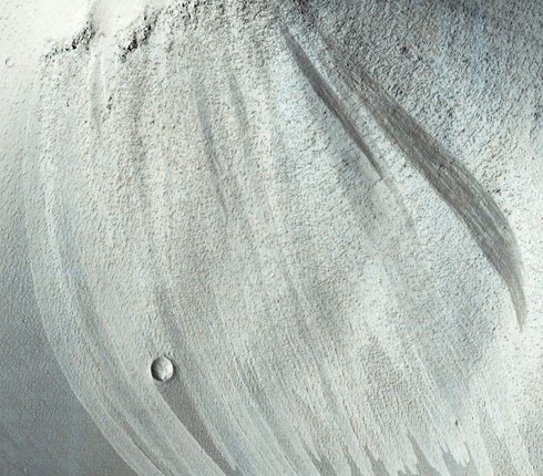 The dark features here look like raindrops, but are actually sand dunes. This spot was targeted by CRISM because the dunes are rich in the mineral olivine.