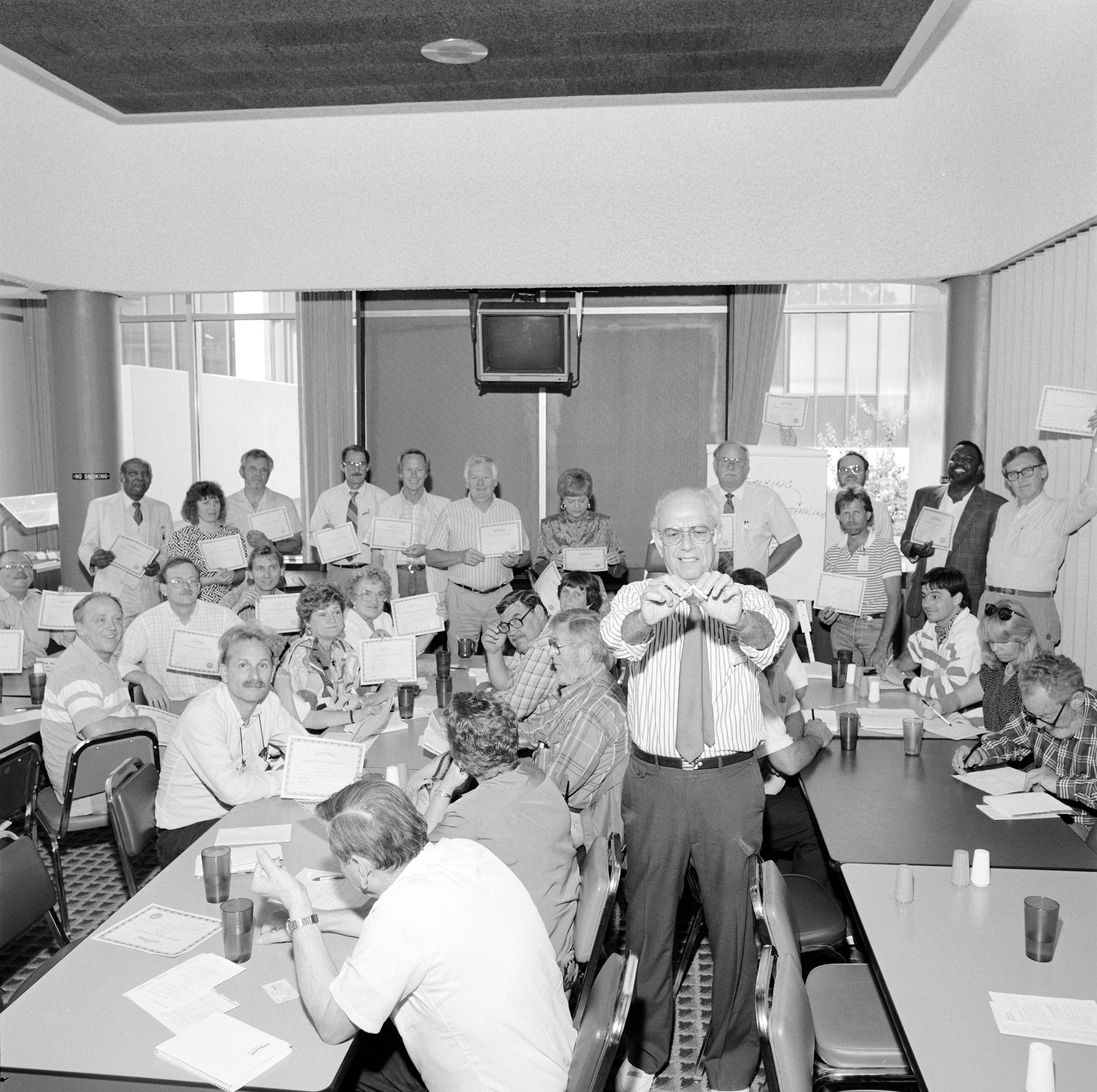 According to a June 1990 Universe article depicting the photo above, “Smokenders course leader Hal Rubenstein symbolically breaks a cigarette as JPLers around him display certificates acknowledging they’ve ‘broken’ the cigarette habit. More than 200 JPLers took the pledge during the after-hours motivational meetings. As of today, Friday, June 22 [1990], all Lab buildings are declared ‘smoke-free,’ with the first official ‘smoke-free’ day starting Monday, June 25.” CL325-4390