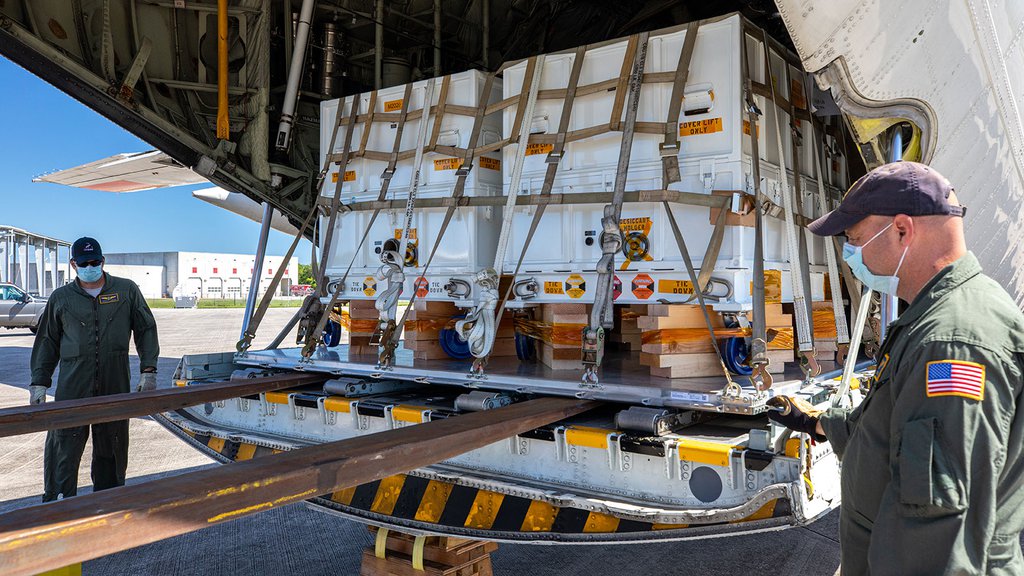 The tubes and their seals were among the nearly 5,000 pounds (2,270 kilograms) of mission flight hardware, test gear and equipment that traveled from JPL to NASA's Armstrong Flight Research Center in Palmdale, California. On May 10, the equipment was loaded onto a C-130 cargo plane from NASA's Wallops Flight Facility in Virginia. The following day, the crew set out for Florida, touching down on Kennedy Space Center's Launch and Landing Facility a little before 3 p.m. local time. They were back at Wallops that evening.