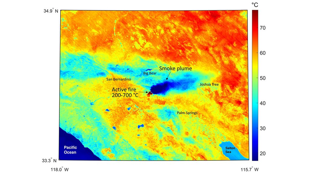 ECOSTRESS recorded the image above at 1:15 p.m. PST (4:15 p.m. EDT) on Saturday, Aug. 1, 2020, when the burn area was approximately 4,000 acres in size. In the image, the black smoke plume can be seen drifting east and over Joshua Tree National Park in the Mojave Desert. With a spatial resolution of about 77 by 77 yards (70 by 70 meters), the image enables researchers to study surface-temperature conditions down to the size of a football field. In the active burn area, temperatures of between 390 and 1290 degrees Fahrenheit (200 and 700 degrees Celsius) were recorded, and in one pixel in the ECOSTRESS image of the burn zone, a peak temperature of 1387 degrees Fahrenheit (753 degrees Celsius) was detected.